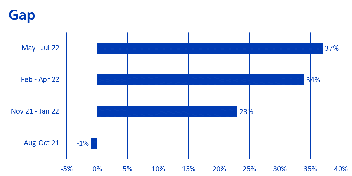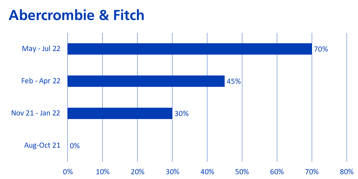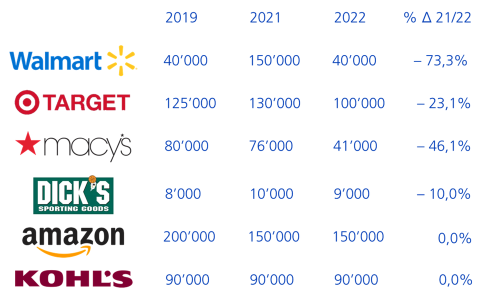 The Association of US Retailers and Online Retailers is also sceptical. It expects retailers to hire between 450,000 and 600,000 seasonal workers in the US. For comparison: in 2021, almost 670,000 seasonal employees were taken on. This is equivalent to a decline of -10.4% to -32.8%.