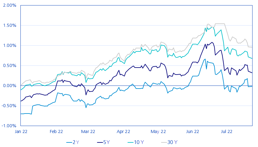 Interest rate risk refers to the dependence of a bond's return on the change in interest rates. Chart 1 shows the development of the yield to maturity (annualised yield achieved by an investor when holding the bond to maturity) for bonds with various remaining maturities. While the yield to maturity of a 10-year Swiss government bond was still -0.11% at the beginning of the year, the value at the end of June was over one percent.