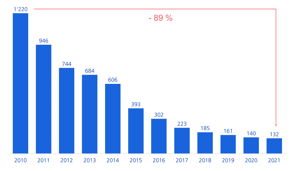 Manufacturers of battery packs have made great progress in reducing costs in recent years. The battery price fell from USD 1,220 per kWh in 2010 to USD 132 per kWh in 2021, i.e. by over 89%.