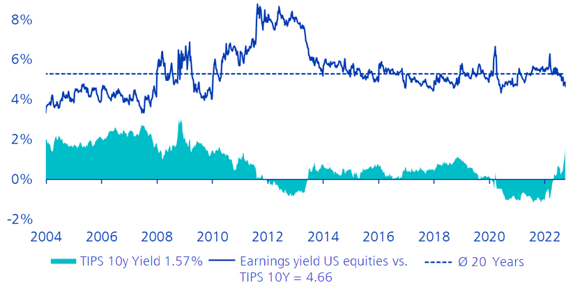 To answer this question, we look at the leading market, the USA. Here, the risk premium for equities has not yet reached an attractive level compared to bonds. How do we measure this? The US earnings yield (1/price-earnings ratio of the US stock market) currently looks unattractive compared to the yield on 10-year TIPS (inflation-protected US bonds) (blue line). This is due to rising real yields (turquoise). This means that the real earnings expectations of equities are not particularly attractive by historical standards. It is worth looking at other asset classes in such an environment.