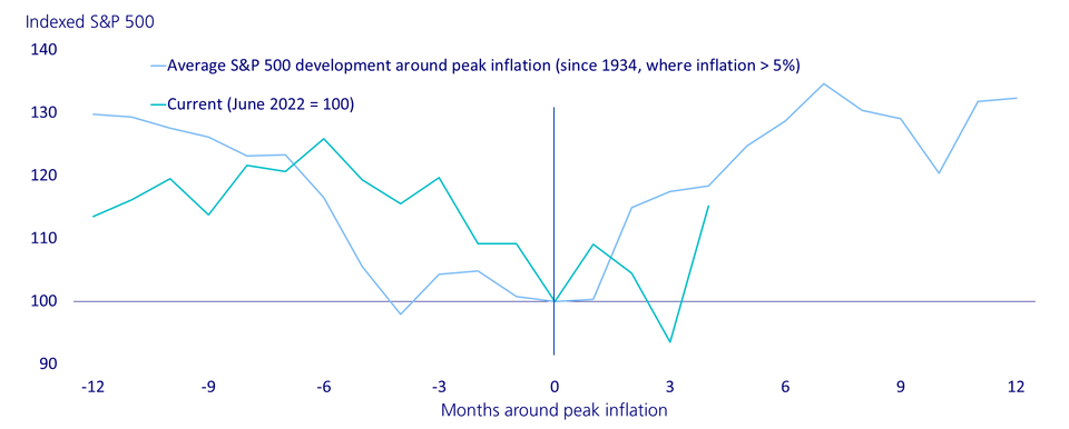 When inflation peaks have just been reached, this has always been positive for equities in the past. This is shown by our analysis, which stretches back to 1934 and examined stock market movements during periods with inflation rates of over 5 percent. In the months leading up to the inflation peak, the S&P 500, which comprises the shares of the 500 largest listed US companies, fell by 30 percent in each case. However, once this peak had passed, equities more than made up for the losses in the months thereafter.