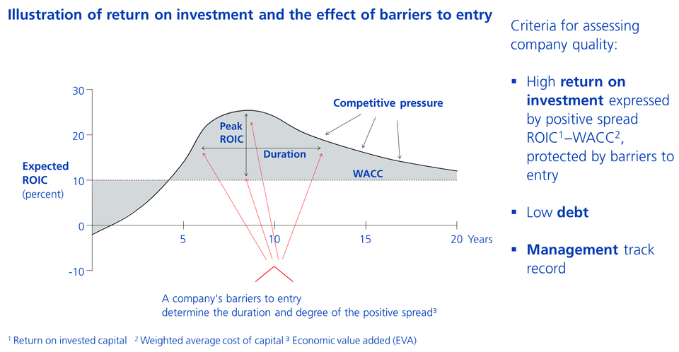 A core element of our quality analysis is based on the qualitative assessment of the business models by our analysis and portfolio management teams. Companies with a sustainability-oriented and value-generating business model usually have long, persistent and high barriers to entry. This allows them to generate an economic value added (EVA) before competitive pressure begins. Ultimately, according to our conviction, this value generation or the economic value added is reflected in the market valuation.