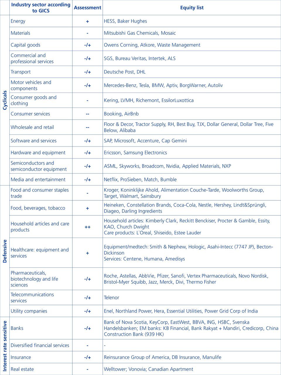 At present, many economies are still in a good economic environment, supported by robust consumer behaviour and a strong labour market. Nevertheless, a more defensive positioning in a global equity portfolio is worthwhile in times of economic uncertainty. The sectors and equity securities shown serve as initial points of reference. Further fundamental analysis based on the securities is recommended. The focus should be on profitable and free cash flow (FCF)-generating companies that earn their cost of capital even in economically uncertain times. Companies, which do not have an urgent need for refinancing and are able to bear their debt burden. Another focus could be on favouring companies that benefit from structural and/or sustainably oriented profitable growth.