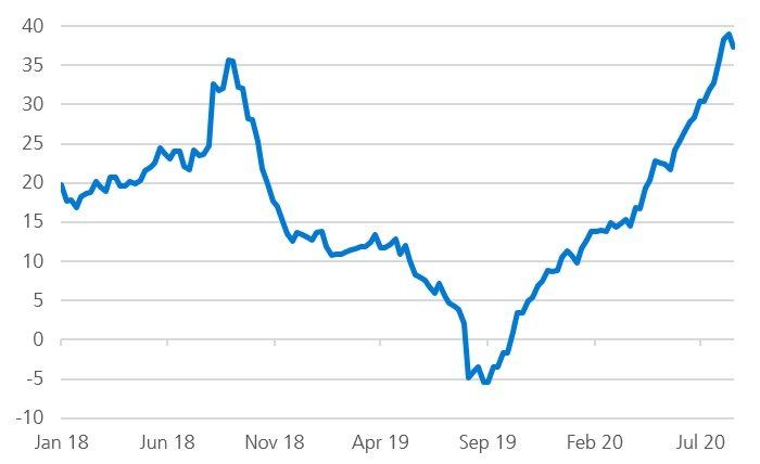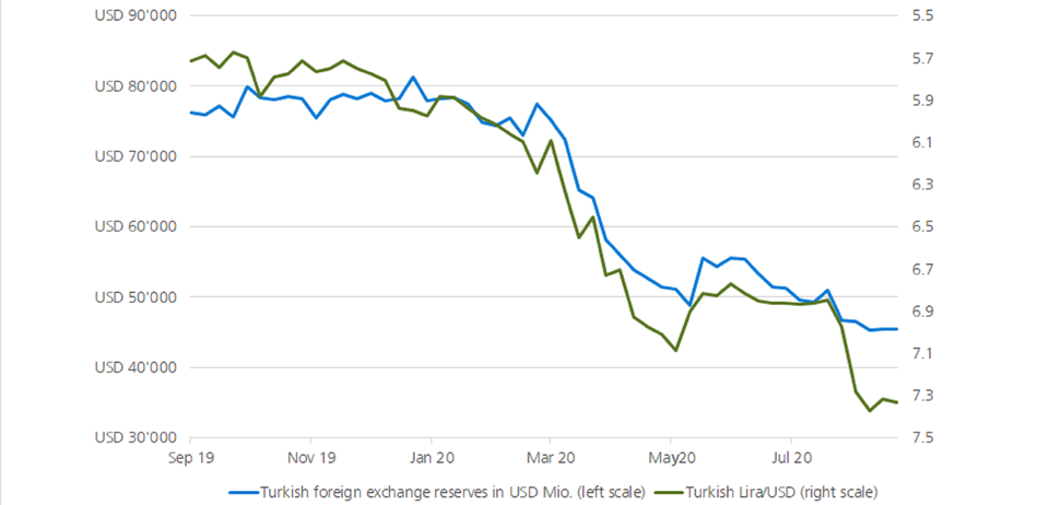 We expect capital inflows to remain low in the coming months given the unattractive real yields and high political and economic risks. Current account inflows from the tourism sector have stagnated at very low levels – only 4% of the previous year's figure in June 2020 and 14% in July 2020.